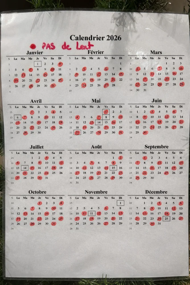 Pour mieux organiser vos achats de lait cru, nous avons mis en place un calendrier du lait qui vous indique les jours où le lait n'est pas disponible. Sur ce calendrier, les jours marqués en rouge signifient que le lait ne sera pas en vente. Nous vous recommandons de nous appeler à l'avance pour réserver votre lait ou de planifier votre visite en conséquence. Cela vous permettra de profiter pleinement de votre passage chez nous sans mauvaise surprise.